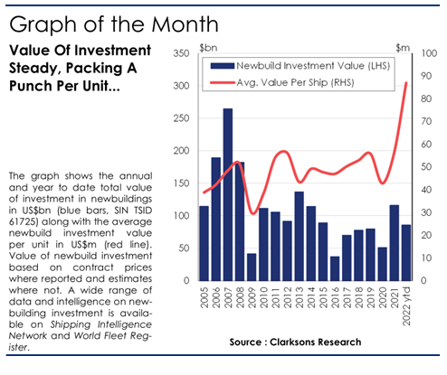 此外,虽然投资总额与2021年同期基本持平,但每艘船平均价格继续大幅增加。2020年,每艘新造船平均价格为4280万美元,2021年增长32%自5650万美元;而截止今年10月初平均造价已经达到了创纪录的8700万美元,对比2021年增长54%,更比2010年代平均水平高出76%。