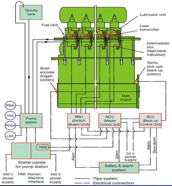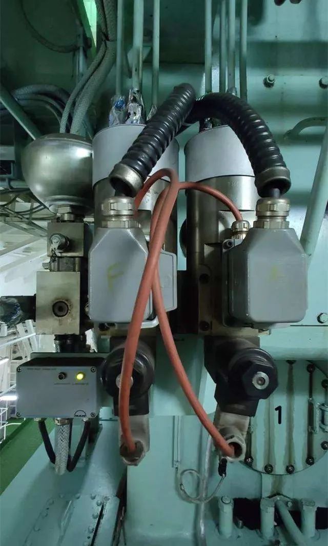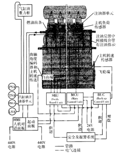 图1 Alpha共轨式汽缸油注油器系统图 主要组成如图1所示,包括: ●气缸油泵站和起动器面板; ●Alpha注油器控制单元一ALCU, 内含主控制单元MCU、备用控制单元BCU、开关板单元SBU等三个分单元; ●每个气缸套对应一个注油器单元(大型机配置两个),每个注油器单元内含6个活塞、一个反馈传感器和一个电磁阀,缸套注油点处安装有相应的注油枪; ●负荷变送器; ●触发系统(曲轴编码器); ●备份触发器系统; ●人机对话面板(HMI)。 二、Alpha 注油器系统的工作原理 1、供油 液压升压泵站提供压力稳定在4.5MPa的气缸油,输送至Alpha注油器单元。 2、注油控制 各气缸的润滑,通过位于各注油器上的电磁阀,控制每次注入气缸油的定量。 通常,第一道环压缩行程上升至对准注油孔时,开始向活塞环注油。 (1)三种控制方式 注油器注油控制方式有MCU主控制方式、BCU备用控制方式、紧急控制方式等三种。三个控制单元分别都安装在一个飞轮旁的盒子内。 ①MCU主控制方式 正常操作时,由MCU控制。 主控制单元MCU,基于准确的定时和主机的平均有效压力,控制位于各注油器上的电磁阀,给相应的气缸套注油。 ②BCU备用控制方式 BCU控制,基于随机正时和rpm模式。 备份触发器系统,由2个传感器组成,将柴油机的转速传输到BCU,同时送到MCU起监视作用。 注油频率在BCU电路板上是可调的,通常设为最小值,即主机的基本注油率的150%。 若MCU检测到注油严重失效,BCU就会自动接替MCU维持Alpha注油器工作。 ③紧急控制方式 紧急控制方式,基于“随机定时"和“rpm依靠式"模式,使主机保持在60r/min的固定速度运转,以25%总量的气缸油供给每一缸,并且不管主机处于运行还是停车状态,都按MCU主板上接触发生器的设定每秒发射一个脉冲信号,即每秒向气缸套注油一次进行润滑。 若角度编码器和BCU系统的传感器信号失灵,可依靠主板MCU板内置的接触发生器,转用紧急控制方式,维持一定的气缸润滑水平。 转用紧急控制方式,需要改变如下电线路: ●断开MCU- J22的接线头1, ●连接一条从MCU-J22接线头1到MCU-J22接线头4的额外线路。 (2)注油率 注油频率通过负荷和速度计算。 负荷变送器,拾取燃油指数(%)给MCU,据此信息和探测到的柴油机转速,计算柴油机负荷,决定注油率。 注油频率,一般与主机的平均有效压力成正比,可以在人机对话HMI板上调整。 各缸注油率,在60%~120%之间。 正常运转时在84%左右,即每分钟注油78次左右; 85%负荷时每天约耗气缸油150kg。 (3)注油定时 注油定时基于从曲轴角度编码器上传来的两个信号,一个是1#缸的上死点信号,另一个是曲轴位置传感器来的曲轴角度信号。 触发系统(曲轴角度编码器),安装在主机曲轴前端,曲轴位置信号和速度信号通过终端盒传递到计算机面板,作为各缸注油定时的依据。 (4)人机交互面板(HMI) 用来显示各种参数值和MCU报警类别、调整单个气缸的注油率、转换升压泵组、人工执行预润滑等。 若系统检测到报警,就会传到集控室内,发生声光报警并在人机对话面板上显示具体报警参数。 3、反馈 各注油器设有传感器,监测注油动作是否已执行,输出反馈信号,并通过各注油器中间盒上的指示灯显示。 三、注油单元